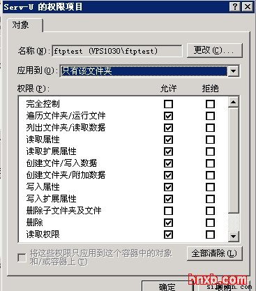 7.假设你有一个WEB目录,路径是d:\web。那么在这个目录的“安全设定”里除了管理员和IIS用户都删除掉,再加入ftptest账号,切记SYSTEM账号也删除掉。为什么要这样设置呢?因为现在已经是用ftptest账号启动的SERV-U,而不是用SYSTEM权限启动的了,所以访问目录不再是用SYSTEM而是用ftptest,此时SYSTEM已经没有用了,这样就算真的溢出也不可能得到SYSTEM权限。另外,WEB目录所在盘的根目录还要设置允许ftptest账号的浏览和读取权限(除了完全控制,更改权限,取得所有权限,遍历文件夹/运行文件),并确认在高级里设置只有该文件夹