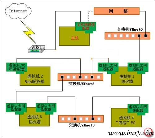 利用VMware Workstation提供的虚拟网络设备,我们可以组建较为复杂的自定义虚拟网络,该网络在您的主机上可以完整的远行,同时,它也可以连接到一个或多个外部的物理网络,包括家庭网络,小型办公网络或Instant。