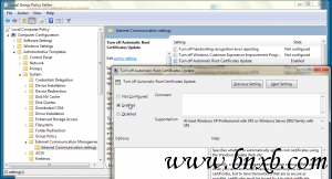 0b:对于Windows Vista/Windows 7用户:组策略(运行->gpedit.msc)->计算机配置(Computer Configuration)->管理模板(Administrative Templates)->系统(System)->Internet 通信管理(Internet Communication Management)->Internet 通信设置(Internet Communication settings),启用(Enable)“关闭自动根证书更新(Turn off Automatic Root Certificates Update)”