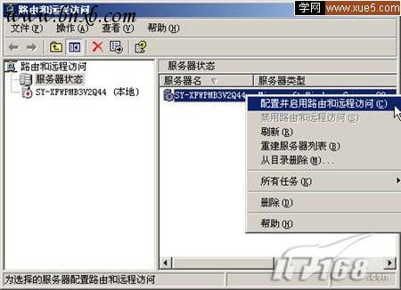 第一步:依次选择“开始”-“管理工具”-“路由和远程访问”,打开“路由和远程访问”服务窗口;再在窗口右边右击本地计算机名,选择“配置并启用路由和远程访问”,如下图所示: