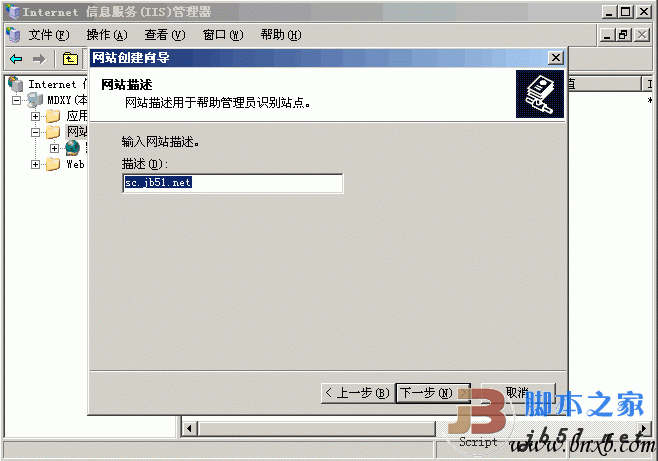 第2步,打开“网站描述”对话框,在“描述”编辑框中输入一段描述网站内容的文字信息,并单击“下一步”按钮。