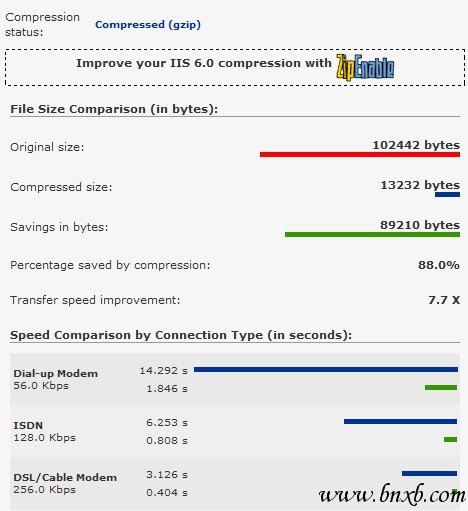 在部署的IIS 6.0上配置了GZIP压缩,详细的测试结果如下。