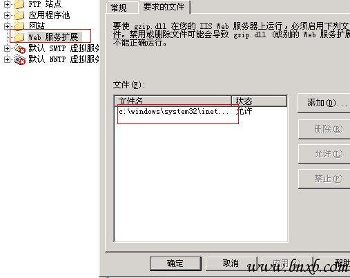 2. 在Internet信息服务(IIS)管理器,右击"Web服务扩展"->"增加一个新的Web服务扩展...",在"新建Web服务扩展"框中输入扩展名"HTTP Compression",添加"要求的文件"为C:\WINDOWS\system32\inetsrv\gzip.dll,其中Windows系统目录根据您的安装可能有所不同,选中"设置扩展状态为允许";