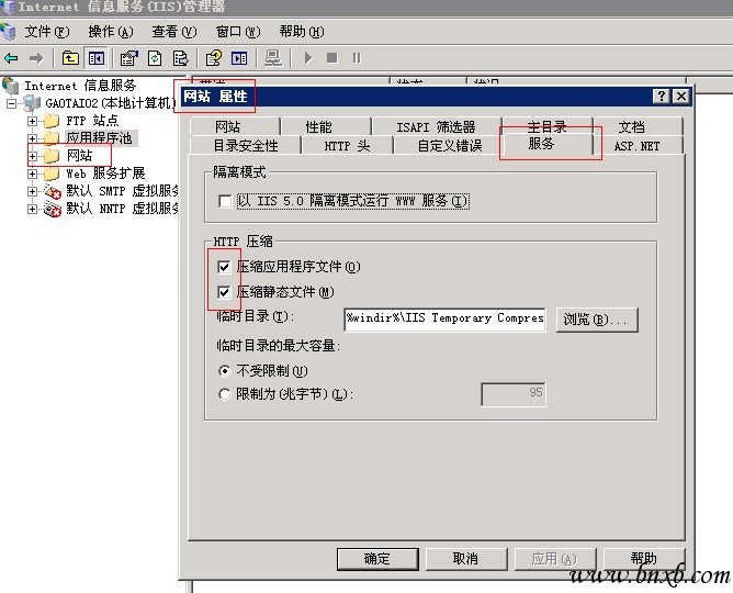 1. 打开Internet信息服务(IIS)管理器,右击"网站"->"属性",选择"服务"。在"HTTP压缩"框中选中"压缩应用程序文件"和"压缩静态文件",按需要设置"临时目录"和"临时目录的最大限制";