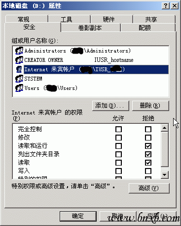 这是非web站点分区的NTFS设置,对存放web站点的分区还要进行额外的设置才可以正常访问。否则在访问网站的时候因为没有运行权限而无法浏览。
