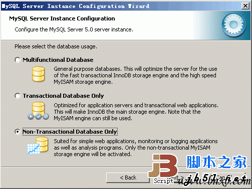 选择MySQL数据库默认存储方式:Non-Trans Only (MYISAM)