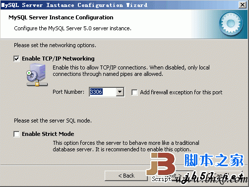 设定MySQL网络参数,注意:不要勾选启用Strict Mode!那个Addfirewall的选项仅在需要外连MySQL的时候勾选上,也就是说给防火墙加个出入站的策略。