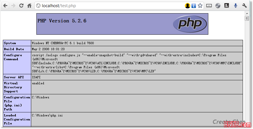 新建一个文本文件, 输入 <?php phpinfo(); ?> 保存为 php 文件, 存放在 Default Web Site 的文件目录( C:\inetpub\wwwroot )下, 在浏览器输入 http://localhost/test.php 即可查看部署的 PHP 信息.