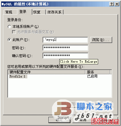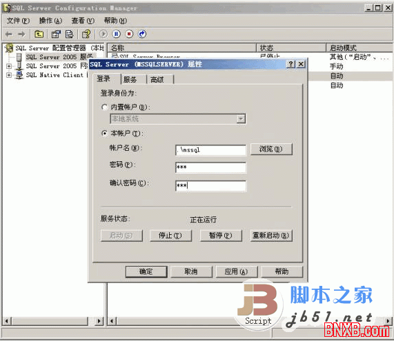 启动服务帐户,选择本帐户,输入:.\帐号名,输入密码,点确定,就OK了