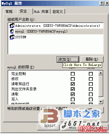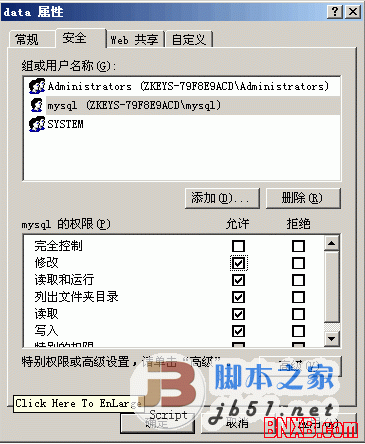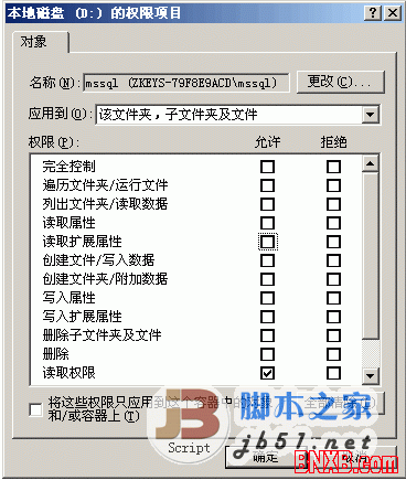 反点D盘,属性,安全,高级,添加,输入创建的帐户名,选择:只有该文件夹,勾上:读取权限(倒数第三个),点确定。MSSQL的DATA目录给MYSQL帐号读写权限