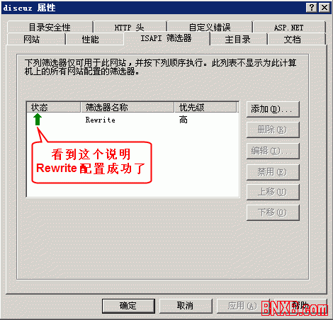 重新选择该站点 => 右键“属性”=> “ISAPI 筛选器”,如果看到状态为向上的绿色箭头,就说明 Rewrite 模块安装成功了。