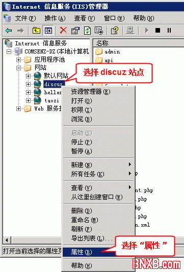 在 IIS 管理器里选择网站,右键选择“属性”,如下图所示: