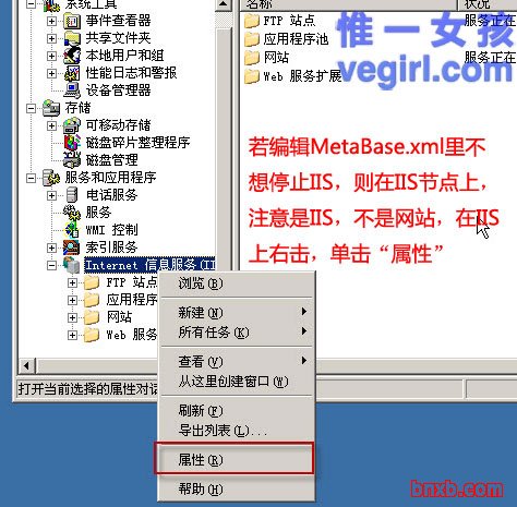 在若编辑 MetaBase.xml里不想停止IIS,则在IIS节点上,注意是IIS,不是网站,在IIS上右击,单击“属性”