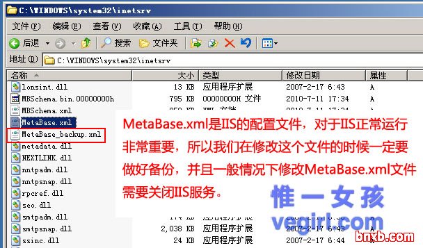 设置Gzip需要手工修改C:\windows\system32\inetsrv目 录下的MetaBase.xml文件,MetaBase.xml对于IIS的运行非常重要,若被破坏轻则IIS不能正常运行,重则可导致重装系统,所以修 改这个文件之前一定要做好备份,下图中名为MetaBase_backup.xml的文件就是一个备份。