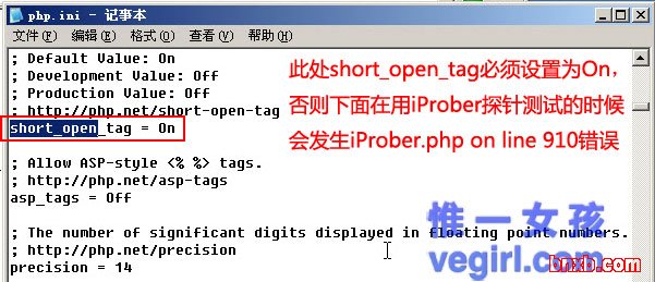 稍 候我们会使用iProber探针来检测php环境,所以这里必须开启short_open_tag = On,否则,会出现“iProber.php on line 910”错误。