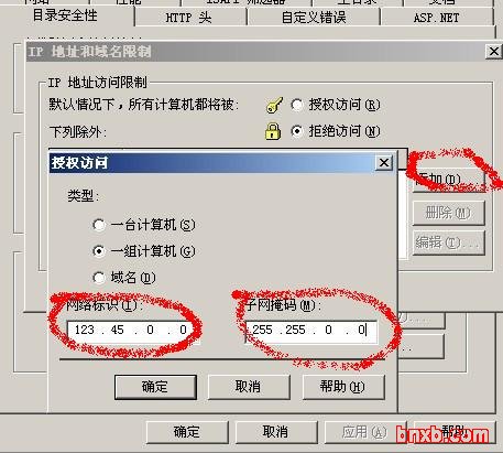 还有一种情况,就是我们大部分站长用的都是动态IP,这种情况怎么应对呢,看图,把原来的一台换成一组,然后输入123.45.0.0,后面输入255.255.0.0然后确定就可以啦,一般ADSL动态IP的变换不会有几个段的,把你经常用的IP段都加进去就OK了!