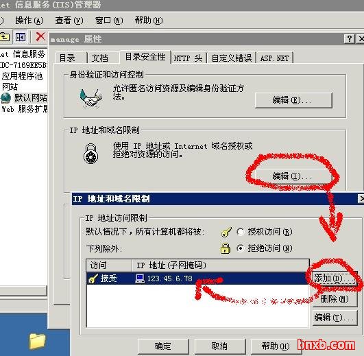操作步骤:打开IIS管理器,找到你要做策略的站点-->然后在后台的目录上点右键属性-->选目录安全性-->点IP地址和域名限制下面的编辑-->点添加,选一台计算机-->在下面的输入框内输入你自己的IP地址即可,如下图所示!