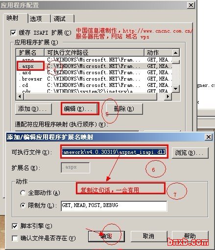 3.如右侧窗口,找到 .aspx 扩展名——》编辑——》复制 可执行文件的路径——》关闭