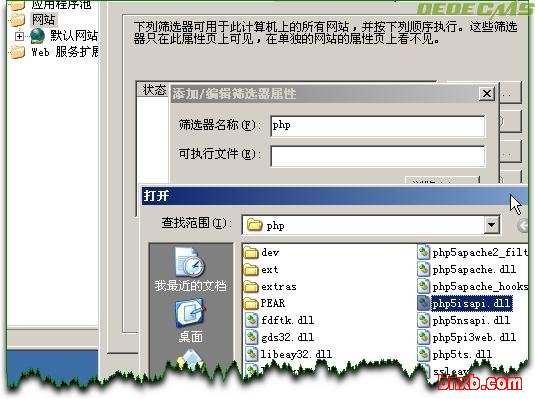在ISAPI筛选器那里添加一个新的筛选器,名称:php,可执行文件还是上面的E:\php\php5isapi.dll