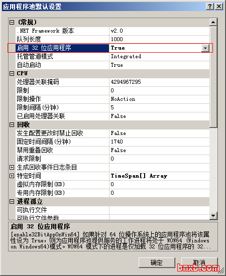 后来搜索网络得到了解决的办法 。原来是自己装的64位Windows 7系统的原因,默认64位环境下,IIS应用程序池未启用32位应用程序,我们只需要启用一下就可以了。打开IIS 7,定位到“应用程序池”,然后选择使用OleDB方式连接数据库的程序池,然后将启用32位应用程序设置为True就可以了。