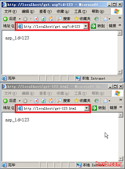 3、在浏览器中分别输入http://localhost/get-123.html 和 http://localhost/get.asp?id=123 ; 如果结果是一样的,则表明重写成功。