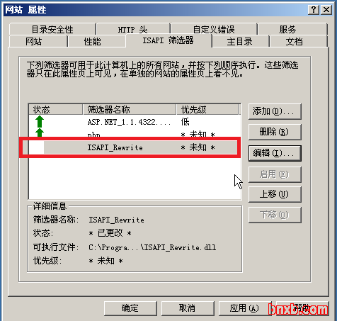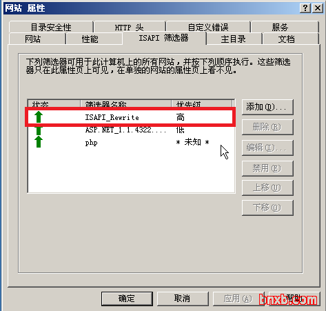 一路确定之后,我们重启下IIS管理器,之后再次打开网站属性的“ISAPI 筛选器”,看下是不是刚刚添加的ISAPI_Rewrite变为绿色向上的箭头呢?这样的话伪静态就配置成功了。