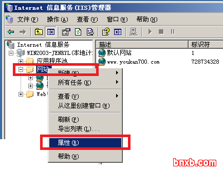 我们打开Internet 信息服务(IIS)管理器,找到“网站”,右键打开“属性”选项卡;