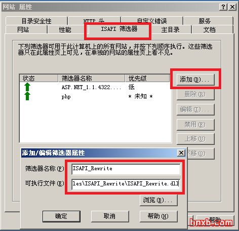 选择“ISAPI 筛选器”选项卡,点击“添加”,弹出“添加/编辑筛选器属性”,“筛选器名称”写上ISAPI_Rewrite,这个可以自定义;“可执行文件”这里,通 过“浏览”找到伪静态组件安装目录下的ISAPI_Rewrite.dll文件即可,路径是C:\Program Files\ISAPI_Rewrite\ISAPI_Rewrite.dll;
