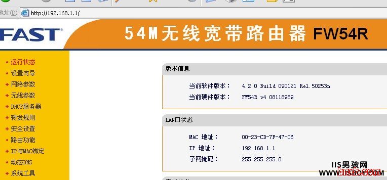 真真的关键功能开始了,在这儿我以自己的FAST路由器做为例子。默认fast的管理台地址是:http://192.168.1.1/,输入帐号密码。这个帐号是必须的,如果你不是路由管理员,那你要想些办法搞到才行。进入管理中心后就是下面这样: