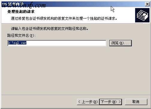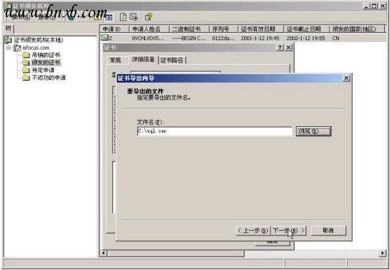 我们需要把证书导出到一个文件,这里我们把证书导出到c: sql.cer这个文件里。