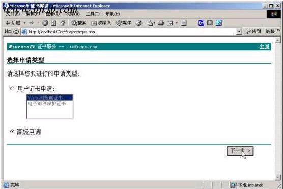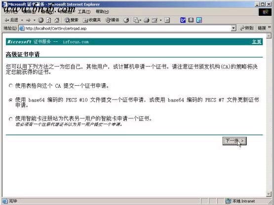完成上面的设置后,我们就要把我们刚刚生成的服务器证书提交给我们刚刚在本地安装的证书服务器。在默认情况下证书服务器完成安装后会在本地的IIS里的WEB服务器里面生成几个虚拟的目录。