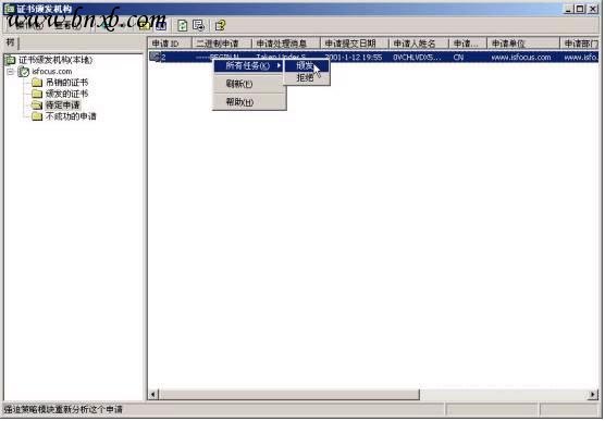 好接下来启动管理工具里的证书颁发机构,在待定申请中找到我们刚刚的申请条目然后点击鼠标右键选择颁发就好了。