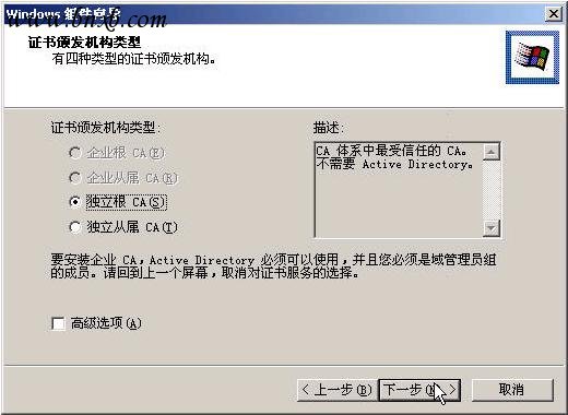 然后选择独立根CA的安装类型。然后在下一步中给自己的CA起一个名字来完成安装就可以了。
