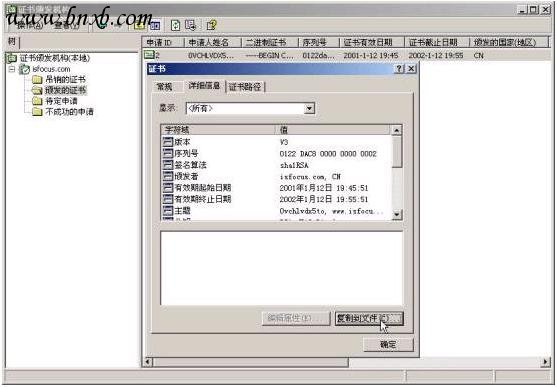 颁发成功以后我们在颁发的证书里找到刚才颁发的证书,双击其属性栏目然后在详细信息里选择将证书复制到文件。
