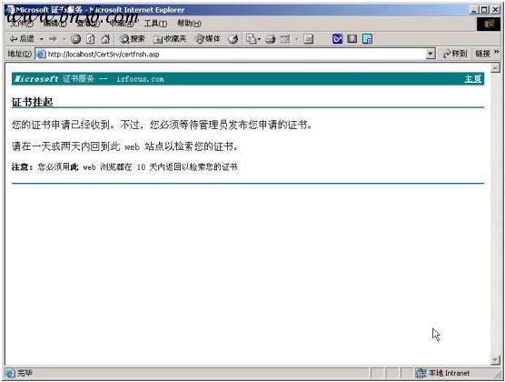 提交成功以后,会返回一个页面给我们告诉我们证书已经成功提交了,现在是挂起状态就是等待CA中心来颁发这个证书了。