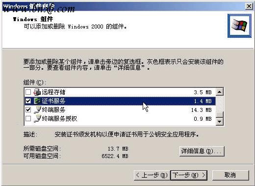 以WIN2000服务器版本的来做例子讲解的,我们首先需要在控制面板里的填加删除WINDOWS组件中去安装证书服务,这个服务在默认安装中是没有安装在系统里的,需要安装光盘来安装。